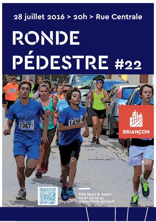 Organisée par le Service des Sports de la Ville de Briançon, la traditionnelle ronde pédestre aura lieu jeudi 28 juillet 2016 à partir de 20h. Au programme : des tours de course à pied pour petits et grands, à travers des rues de Briançon fermées à la circulation automobile. Le circuit de 1,250 km démarrera au pied de la Chaussée, empruntera l'avenue Maurice Petsche, l'avenue du Général de Gaulle, la rue Alphand, la rue Centrale et l'avenue du 159e RIA pour arriver place de l'Europe. Une manifestation conviviale pour toute la famille, avec ravitaillement offert et lots pour les participants. Inscriptions gratuites dès 18h30 sur la place de l'Europe. Renseignements et inscriptions auprès du service des Sports : 04 92 20 10 41 Les parcours:-Ecole d'athlétisme: 500m de course (enfants nés en 2007 et après)-Poussins: 1 tour, soit 1,250km (nés en 2005/ 2006)-Benjamins et Minimes: 2 tours, soit 2,5km (nés en 2003/2004 et 2001/2002)-Populaires et Licenciés : 4 tours, soit 5km (à partir de 2000)