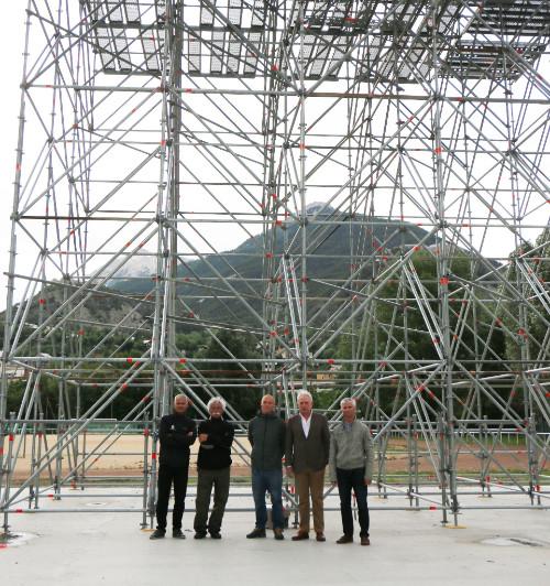 Pour accueillir cette infrastructure dans la durée, la Ville de Briançon a commencé par couler une dalle en béton armé de 175 mètres carrés, entre le stade de rugby et le terrain de foot. Car il fallait un support stable pour dresser une structure d’escalade de 16 m de haut. D’autant que le terrain est meuble, comme l’a révélée une étude de sol préalable. Pour sécuriser l’installation, le volume de l’échafaudage a été légèrement réduit et les Services Techniques de la Ville ont créé une dalle qui répartit les poids et fait office de lest. Sur ce socle solide, d’un montant de 14 000 €, l’équipe du Mondial monte actuellement le mur avec un nouveau système d’ancrage au sol renforcé.