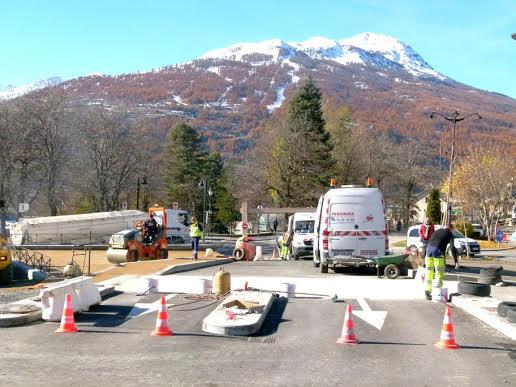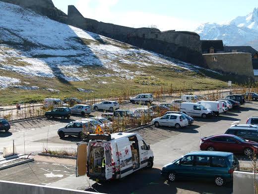 Les opérations d'enrobé continuent également. Un sol grenaillé beige revêt l'entrée du parking, dessine l'accès à la porte de Pignerol et trace également les cheminements piétonniers sur les 4 travées reliant le glacis à la route nationale. Le marquage au sol est matérialisé par des angles verts, pour une meilleure intégration paysagère.