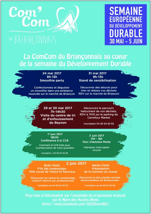 Dans le cadre de la 15ème édition de la semaine Européenne du Développement Durable, la Communauté de Communes du Briançonnais propose de nombreuses animations à destination de tous les briançonnais et socio professionnels. Au programme : > 24 mai de 9h -13h : Smoothie party sur le marché de Briançon confectionnez et dégustez votre smoothie dans une ambiance musicale endiablée. > 29 et 30 mai de 7h à 14h30 : Visite du centre de tri et d’enfouissement du Beynon découvrez le parcours étonnant de vos déchets au quotidien – Le transport en car est pris en charge gracieusement par la Communauté de Communes du Briançonnais. Inscription obligatoire avant le mercredi 24 mai au 04 92 54 52 52 > 31 mai de 9h à 13h : Stand de sensibilisation sur le marché de Briançon Découvrez les astuces pour trier et réduire vos déchets. > 1er juin 18h30 jusqu’à 20h – Conférence : Comment les collectivités luttent pour la préservation de votre environnement quotidien – salle du conseil - Inscription au 04 92 54 52 58 > 2 juin : 8h30 à 11h P’tit déj compostage Pôle social Villard Saint Pancrace à l’attention des socio professionnel de la restauration Découvrez les vertus du compostage collectif - Inscription au 04 92 54 52 5216h30 17h30 : Découvrez la plus grande centrale photovoltaïque du Briançonnais située dans la zone sud - Inscription au 04 92 54 52 58 > 3 Juin de 15 à 18h : Atelier papier recyclé au parc Chanoine Motte fabriquez votre propre papier recyclé.