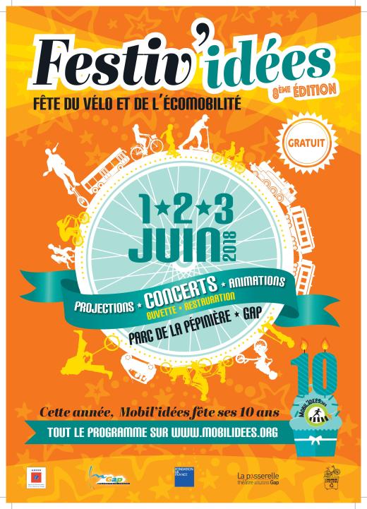 L'association Mobil'idées organise le week end du 1-3 juin son traditionnel "Festiv'idées", grande fête du vélo et de l'écomobilité, à Gap parc de la Pépinière, théâtre de verdure. Cette manifestation sera l'occasion de célébrer les 10 ans de l'association.