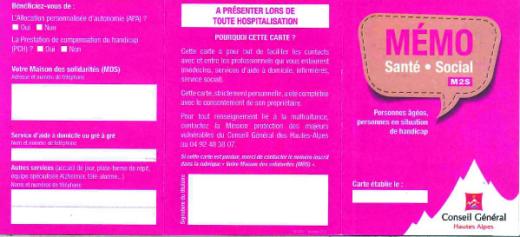 Il est simple, pratique et peu se glisser facilement dans une poche ou dans un portefeuille. C’est le MEMO Santé-Social que vient d’éditer le Conseil Général des Hautes-Alpes en lien avec les Maisons des Solidarités du Département (MDS) où il est notamment disponible gratuitement.