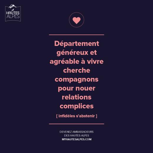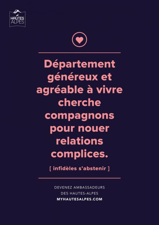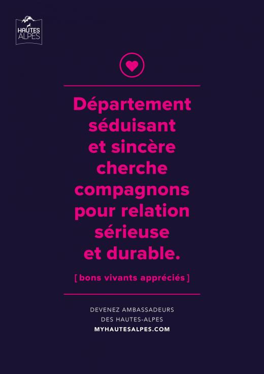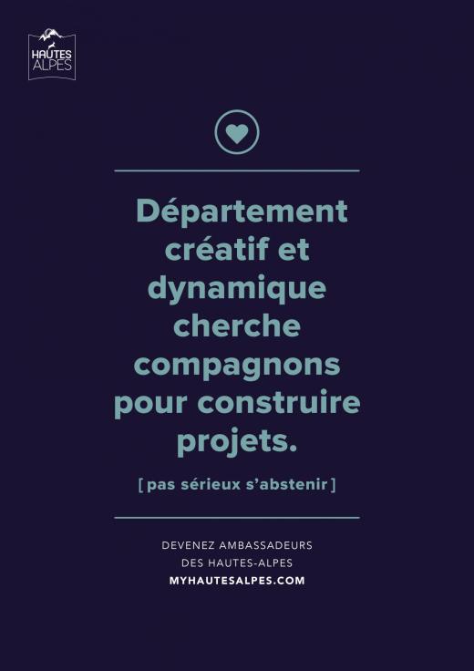 Sous l’angle décalé et original d’un site de rencontres, cette campagne de communication vise à réunir dans le cadre d’un Club (de rencontres), tous ceux qui aiment leur département et qui veulent le faire savoir et le promouvoir. Le Club MY HAUTES-ALPES est avant tout un espace d’expression, d’échanges et de réseaux.