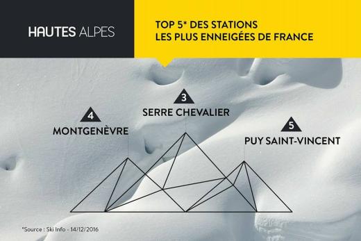 1. Que 3 stations des Hautes-Alpes figurent dans le Top 5 des stations les plus enneigées de France selon Ski Info (Serre Chevalier, Montgenèvre et Puy-Saint-Vincent) et d'autres sont également bien servies comme Vars, Risoul, le Queyras ou Les Orres.