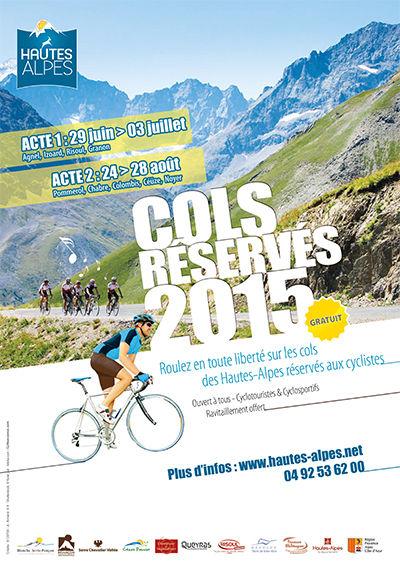 A quelques jours de la venue de la 102ème édition du Tour de France, le département des Hautes-Alpes offre aux amoureux de "la petite reine", la possibilité de gravir les cols mythique du territoire haut-alpin en toute sécurité et dans une ambiance unique, sportive et conviviale. Organisée depuis 1997, l'opération "Cols réservés 2015" se déroulera cette année en matinée de 9h à 12h du 29 Juin au 3 Juillet et du 24 au 28 Août. Mis en place par l’Agence de Développement des Hautes-Alpes et les Offices de Tourisme, ce rendez-vous très attendu sera l'occasion de procéder à la fermeture à la circulation motorisée de certains cols et routes de montagne afin de permettre aux cyclistes, atteindre les sommets en toute sécurité.