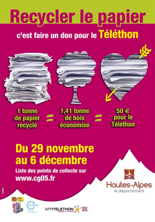 Le Conseil Général des Hautes-Alpes ainsi que de nombreuses autres collectivités du département, vont participer à l’édition du Téléthon 2014, en partenariat avec Ecofolio éco-organisme des papiers et l’AFM (Association Française contre les Myopathies), en organisant une opération intitulée « le Téléthon des vieux papiers ».