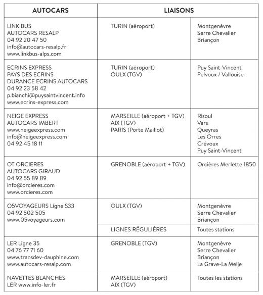Grâce à la Loi Macron, de nouvelles dessertes vont être proposées par les transporteurs et autocaristes haut-alpins au départ des gares TGV et aéroports de la région. Les Autocars Imbert proposeront des navettes « Neige Express » au départ de Marseille (aéroport et TGV), Aix en Provence (TGV) et Paris (Porte Maillot) vers les stations des Orres, Vars, Risoul, Le Queyras, Crévoux et Puy Saint Vincent. Les Autocars Resalp assureront au cours de l’hiver, des liaisons « Link Bus » depuis l’aéroport de Turin, grâce à la mise en place d’une ligne régulière Turin - Montgenèvre - Serre Chevalier. Une desserte assurée également par la société Durance Écrins Autocars en lien avec le Pays des Écrins avec un « Écrins Express » depuis Turin et Oulx TGV vers les stations de Puy Saint-Vincent, Pelvoux et Vallouise. De même, des liaisons régulières seront assurées depuis Grenoble (Aéroport Grenoble Isère et TGV) vers la station d’Orcières Merlette 1850 par les autocars Giraud. Quant à la structure 05voyageurs, elle assure des liaisons depuis Oulx-TGV vers Montgenèvre, Serre Chevalier et Briançon ou au départ de la gare de Grenoble TGV en direction de La Grave-La Meije, Serre Chevalier, Briançon et Montgenèvre, ainsi que toutes les liaisons régulières qui desservent les stations des Hautes-Alpes. Un dispositif varié renforcé par des « Navettes blanches » LER depuis l’aéroport Marseille-Provence et Aix TGV vers l’ensemble des stations des Hautes-Alpes.