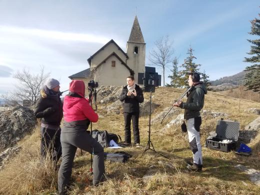 Photos : Scène de tournage de l'équipe Ushuaïa TV au village de Réallon.