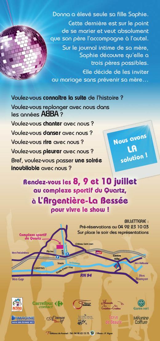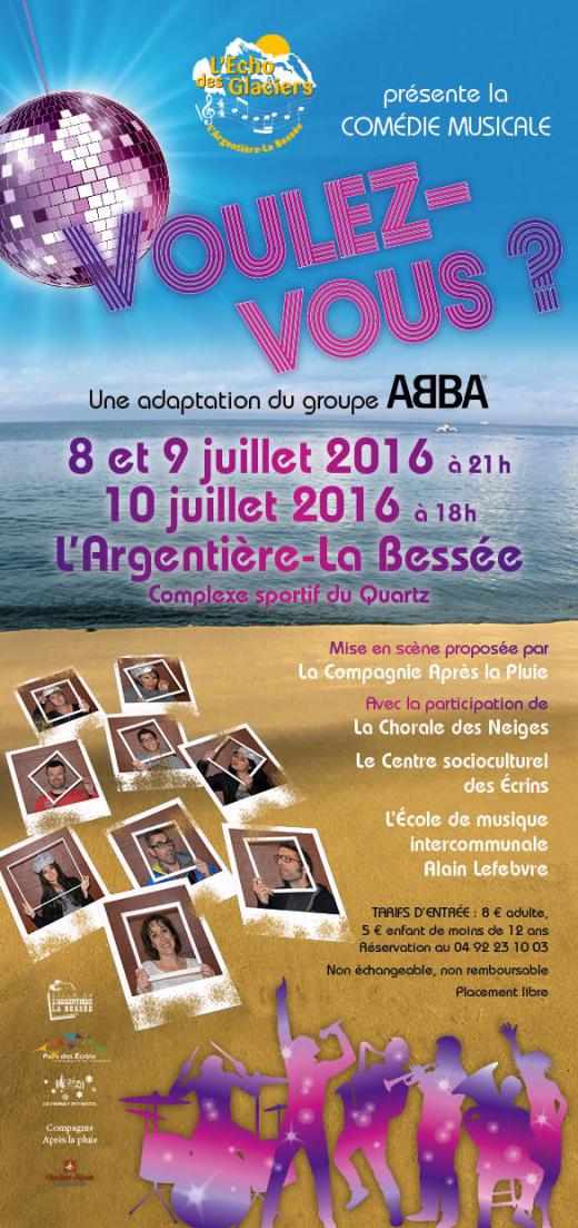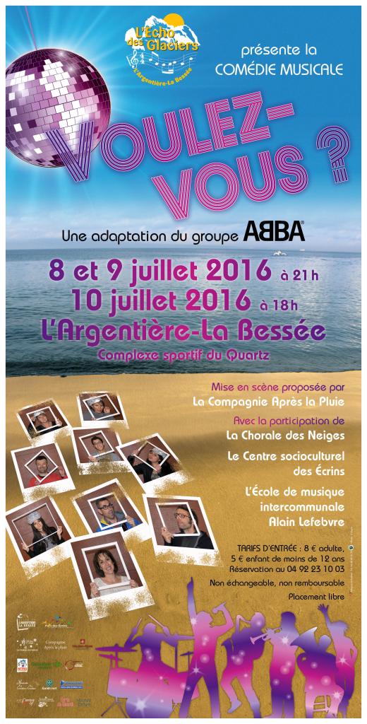 Une idée originale : Ce projet est né de discussions en 2015 au sein de l’association l’Echo des Glaciers, Harmonie municipale de L’Argentière pour apporter modernité et ambition autour d’un projet un peu fou.A presque 100 ans, la vieille dame qu’est l’Echo des Glaciers a eu envie de se prendre pour une jeunette. De Là a germé l’idée d’une comédie musicale. Au départ, un spectacle autour des années 80 a été évoqué et a évolué vers les années plus disco pour s’arrêter sur le groupe ABBA. Des musiques entrainantes, connues et festives qui traversent les générations. Un projet fédérateur : Comme elle est généreuse cette vieille dame, elle a eu envie de construire le projet avec toutes le forces vives du canton de L’Argentière-La Bessée, qui ont, pour son plus grand plaisir, répondu à sa sollicitation. Des structures intervenant dans le domaine de la musique, du chant, du théâtre et de la danse participent au projet.
