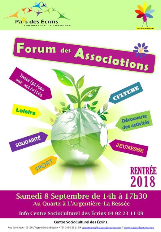 2018 n’y échappera pas : la Communauté de communes du Pays des Ecrins vous invite à ce rendez-vous annuel du Forum des associations le samedi 8 septembre de 14h à 17h30 au complexe sportif du Quartz à L’Argentière-la Bessée.
