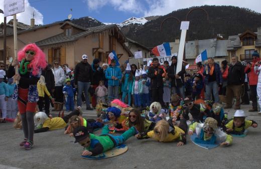 A 14h30 c’est le challenge des Clubs que les spectateurs ont pu observer et admirer. Sous forme de défilé déguisé sur la thématique du « S » les meilleurs déguisements ont été récompensés. Un spectacle haut en couleurs ou des Sorcières ont côtoyé des Supers Héros, des Schtroumpfs, des Sioux, des Smarties et bien d’autres S. C’est le club d’Orcières Merlette qui gagne cette manche en défilant sur le thème des « Surfeurs » dans une ambiance Beach Boys.