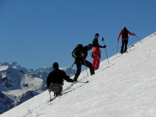 « Nous n’étions que trois personnes pour tracter Thierry au lieu de la dizaine prévue au départ, puisque nous n’étions pas surs de pouvoir effectuer la sortie. Il y a environ 300 mètres de montée pour accéder au sommet de la Plane depuis les vallons de la Doire et malgré le dénivelé, nous avons décidé de tenter le coup » explique Patrick Veyre, moniteur esf à l’origine de l’aventure.