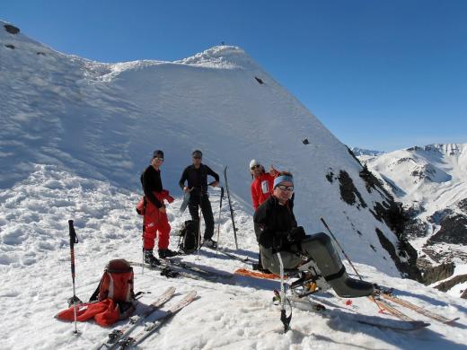 Après environ une heure d’effort, les quatre skieurs arrivent au sommet. « Ils ont dû tracter pas loin de 90 kg, entre mon poids et l’équipement de ski assis, de vrais « bêtes » », dixit Thierry en remerciant Patrick Veyre, Yann Estienne et Bruno Pleindoux, avec un grand sourire.