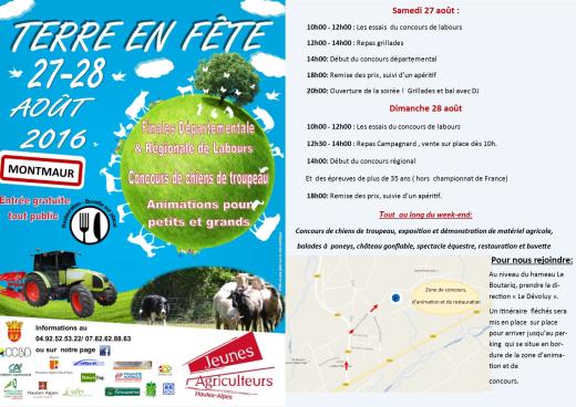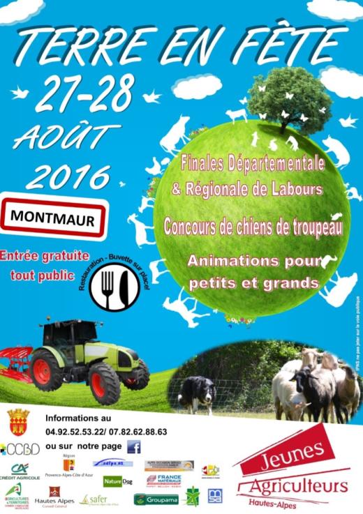 Le Syndicat local des Jeunes Agriculteurs de Gap organise les finales départementales et régionales de labours le samedi 27 et dimanche 28 août, à Montmaur. Le concours départemental de labours est chaque année un évènement incontournable pour les agriculteurs et professionnels des Hautes-Alpes. Il réunit le monde agricole et le grand public autour d’une compétition unique en son genre dans une ambiance festive ! Les finales régionales 2016 dans les Hautes Alpes !Cette année JA Gap a l’honneur et le plaisir d’organiser les finales régionales. Elles permettent de qualifier les meilleurs laboureurs des deux catégories existantes pour participer au Championnat de France les 9, 10 et 11 septembre en Vendée. Nouveauté cette année :Un concours spécial « + de 35 ans » est organisé en plus des finales officielles. L’occasion pour les meilleurs laboureurs de ces dernières années de s’affronter le dimanche pour décrocher le titre de « meilleur laboureur Haut Alpin de plus de 35 ans », le tout dans une ambiance festive et conviviale.Un concours de chiens de troupeau aura lieu durant le weekend. Le grand public pourra découvrir au travers de ce beau spectacle le travail du berger, la complicité entre le maitre et son chien et son importance dans notre agriculture de montagne. De nombreuses animations :Tous au long de ces deux jours nous vous proposons de nombreuses animations : exposition et démonstration de matériel agricole, spectacle équestre, balade à poney, château gonflable… Vous pourrez venir vous rafraichir à la buvette sur place et des repas à base de produits locaux vous seront proposés les samedi midi, samedi soir et dimanche midi. Samedi soir place au bal avec DJ !