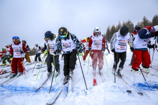 Le Red Bull Tout Schuss c’est plus de 300 participants, femmes et hommes qui partent en sprint tous en même temps vers leurs skis ou snowboards en jouant des coudes, pour ensuite descendre jusqu’au pied des pistes où un afterski les attend.