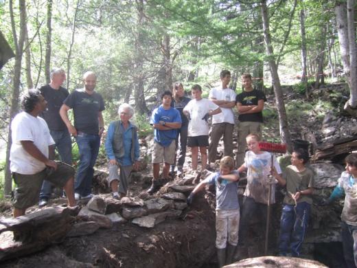 L’an dernier sur ce même canal, les jeunes avaient mis à jour les ruines à peine perceptibles d’un très ancien moulin et notamment sa meule ; ils avaient utilisé un palan pour la repositionner sur un nouvel appui, ils avaient également remis en place la chenal en vieux mélèze enfouie sous le ruisseau permettant d’amener l’eau.
