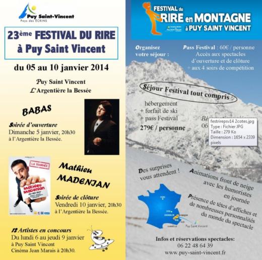Le 23ème Festival du Rire de Puy-Saint-Vincent a démarré ce dimanche. De nombreuses personnalités et humoristes vont passer cette semaine sur la station. Un festival qui vous fait découvrir de jeunes talents : les têtes d’affiches de demain. Cette année, 9 spectacles sont en compétition, pour décrocher le Grand Prix, le Prix de la Presse et le Prix du Public. Lundi 6 janvier : Laurence Ruatti propose des portraits de femmes cinglées, décalées, voire délurées. Steeven et Christopher, deux jumeaux qui regardent la réalité avec un second degré provocateur. Anne-Sophie La Bajon est une humoriste sociale, qui parle d’Assedic, de RS, ou encore d’APL. Mardi 7 janvier : Marine Mousson part, elle, dans des envolées lyriques pleines de folies et d’énergie. Fabien Olicard mélange humour, magie et mentalisme. Riyad Bassim a enfin trouvé un job qui lui plait : comédien. Mercredi 8 janvier : Béatrice Facquer préfère sortir des clous. Daniel Camus décortique nos absurdités du quotidien. Antoine Schoumsky est en prison. Pour en sortir, il doit réussir son spectacle. Pour la soirée de clôture, vendredi 10 janvier, Mathieu Madenian, humouriste vu dans l'émission "Vivement Dimanche Prochain" aux cotés de Michel Drucker sur France 2. Le programme complet du 23ème festival du rire de Puy-Saint-Vincent sur puy-saint-vincent.fr. A noter que le jury sera notamment composé de Thierry Beccaro, Tex, Gérald Dahan, ou encore Arnaud Tsamère venu dans l'édition 2013 du Festival du Rire.