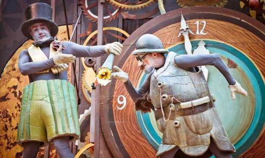 La magie s’échappe de la gigantesque horloge de la compagnie catalane La Tal qui fascine par sa taille, ses couleurs et sa mécanique. Au son de l’horloge, chevaliers et clo ns sortent du cadran et remplissent la scène où querelles et passion s’entremêlent.