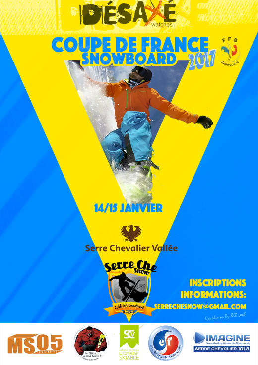 Le club de BRIANCON SERRE CHE SNOWBOARD organise le weekend end du 14/15 janvier 2017, 4 courses comptant pour la coupe de France de Snowboard (2 le samedi, 2 le dimanche) sur le stade de Ratier - Chantemerle. Ces épreuves seront ouvertes à tout public (licenciés ou non) et toute catégorie après inscription (30 € par jour et par licencié, 35 € par jour si non licencié, collation comprise). Les inscriptions devront être envoyées par mail avec l'intitulé "cdf1415" avant le jeudi 12 Janvier 2017 18h à cette adresse: serrechesnow@gmail.com Cela fait 16 ans que la station et le club n'avaient pas organisé ce genre de compétition sur Ratier. Tous les acteurs locaux ont donc joué le jeu. Beaucoup de participants sont attendus sachant que toutes les autres courses en France ont été annulées à cause du manque de neige. Les meilleurs français seront donc présents sur l’épreuve !D'un point de vu local, les riders du Serrechesnow sont aux avant-postes ! Plus d’infos sur : https://www.facebook.com/events/1852056888365641/ Contact : Vincent Chaix - 0689659344