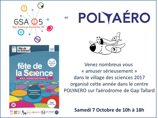 A l'occasion de cette 26ème édition, Gap Sciences Animations vous invite les Vendredi 6 Octobre de 9h00 à 17h00 (pour les scolaires) et Samedi 7 Octobre de 10h00 à 18h00 (pour le public) dans le cadre du centre de formation aéronautique POLYAERO de Tallard, à venir vous amuser "sérieusement" au sein d'un véritable "village des sciences".