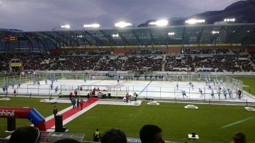 Alors, pour l'occasion, les Bruleurs de Loup de Grenoble ont voulu faire les choses en grand. Des groupes musicaux mais aussi 120 danseurs et des pom-pom girls se sont relayés pendant 45 minutes, histoire de bien faire monter l'ambiance. A 16h 20, ce sont les joueurs qui ont fait leur entrée sur la glace pour la traditionnelle séance de "warm-up", l'échauffement d'avant-match. Puis, cinq minutes avant le coup d'envoi, 80 choristes gospel ont pris possession de la pelouse pour donner le véritable coup d'envoi de ce match hors-norme !